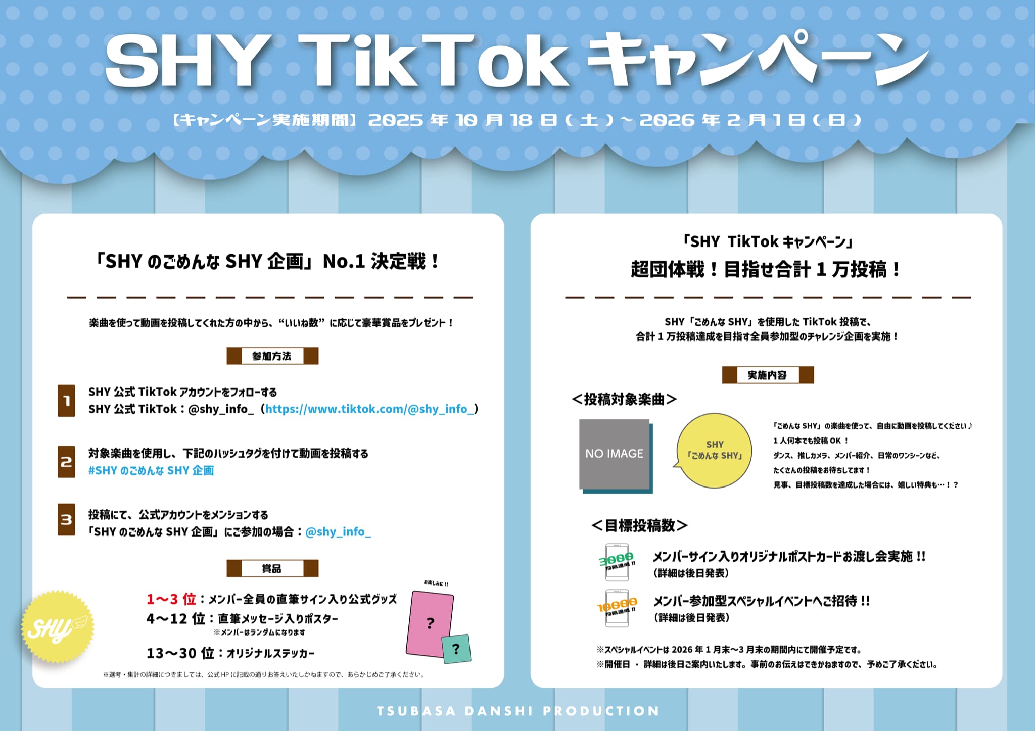 【NEWS】10月18日(土)よりスタートするデビューシングル発売記念リリースイベントにて「SHYの大応援キャンペーン」&「SHY TikTokキャンペーン」実施決定!