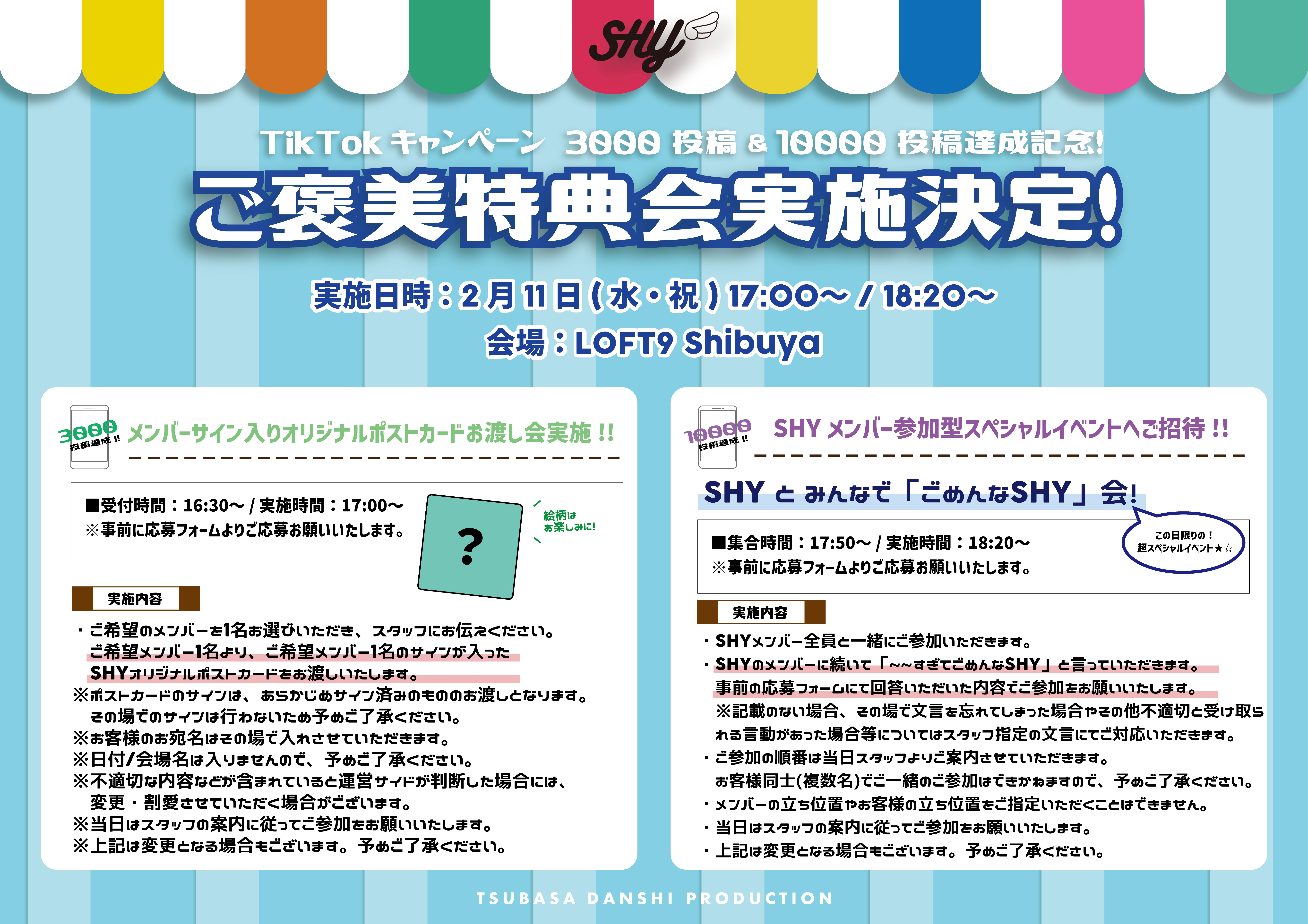 みなさまの応援のおかげで、SHY「ごめんなSHY」 TikTok音源の合計投稿数3,000投稿&10,000投稿達成!それに伴い、ご褒美特典会の実施が決定いたしました!